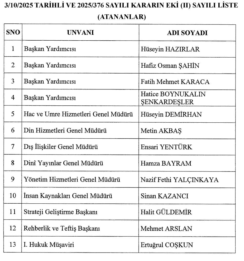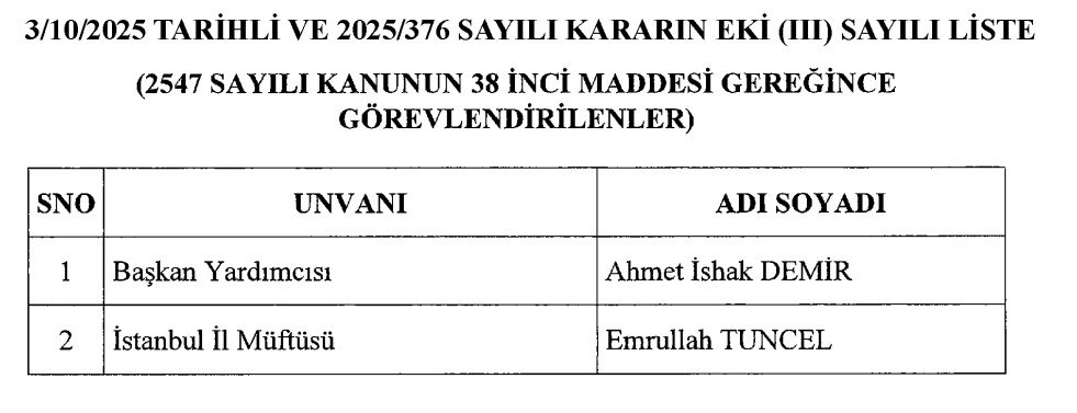 3 Ekim 2025 tarihli Resmi Gazete'de yayımlanan Atama Kararları şöyle: