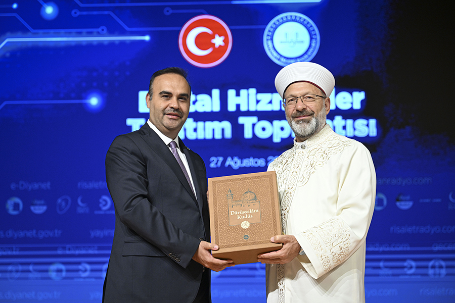 Uygulamada emeği geçenlere teşekkür eden Başkan Erbaş, Bakan Kacır'a "3 ciltlik Darüsselam Kudüs Eseri"ni hediye etti.