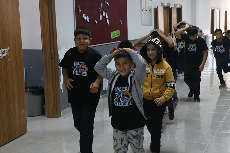 Hatay'daki okullarda da Milli Eğitim Bakanlığının "Afetler ve Dayanıklılık Ayı" etkinlikleri kapsamında eş zamanlı tahliye tatbikatı düzenlendi.