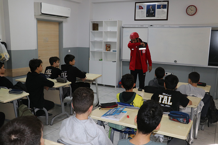 Adana'da Mehmet Tal İmam Hatip Ortaokulu'nda, İl Milli Eğitim Müdürlüğü bünyesinde oluşturulan Arama Kurtarma Birimi (AKUB) görevlilerince öğrencilere afetler ve afet anında yapılması gerekenlere ilişkin bilgi verildi.