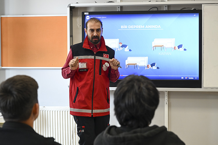 MEB AKUB üyeleri, öğrencilere deprem öncesinde ve esnasında yapılması gerekenlere ilişkin bilgilendirmede bulundu, ardından gerçekleştirilen tatbikatta, öğrenciler siren uyarısıyla çök-kapan-tutun tekniğini uyguladı.