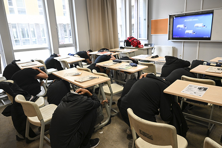 Senaryo gereği okulda alarmın çalmasının ardından öğrenciler sınıflarda "çök-kapan-tutun" hareketini uyguladı.
